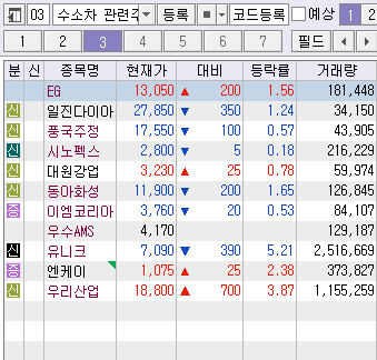수소차 관련주 EG, 일진다이아, 풍국주정, 시노펙스, 대원강업, 동아화성, 이엠코리아, 우수AMS, 유니크, 엔케이, 우리산업 등의 관련 주식 편입 이유 알아보세요. 관련 검색어는 수소차주 수소차 주식 수소 대장주 테마주 수혜주 입니다.
